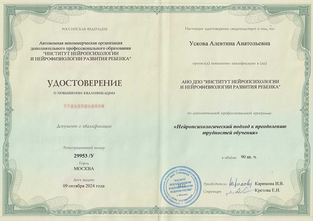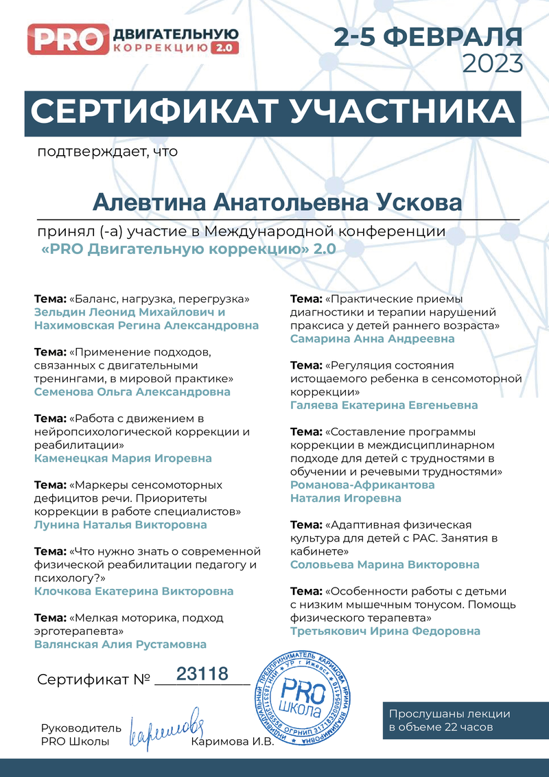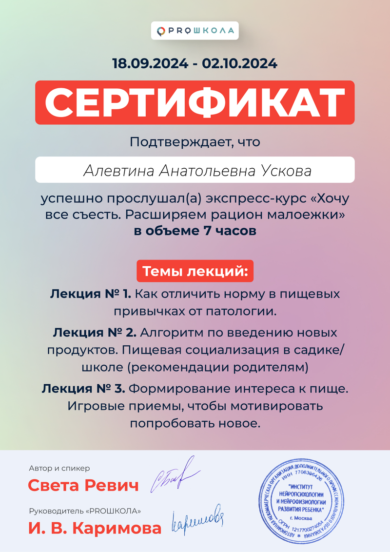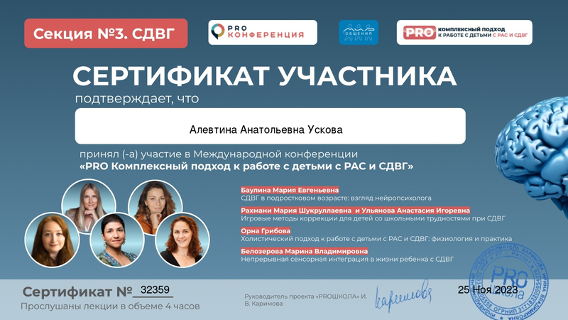 Постоянного повышаю свою профессиональную компетенцию, учувствую в профессиональных конференциях, вебинарах, нейрофестивалях.