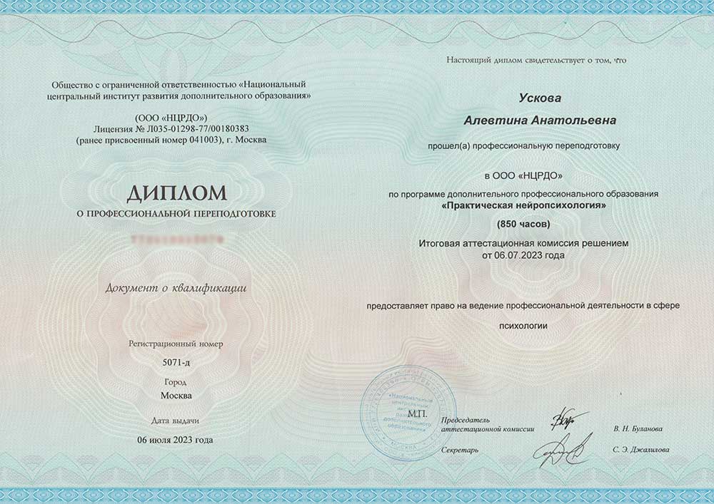 Практическая нейропсихология с правом ведение образовательной деятельности в сфере «психология»